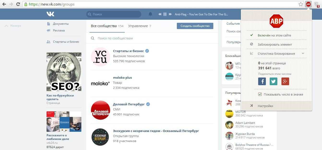 Осталось лишь самое главное, проверить работает ли плагин. Перейдите в контакт и понаблюдайте за рекламой, проявляется ли она или нет. Напоминаю, требуется обновить страницу!