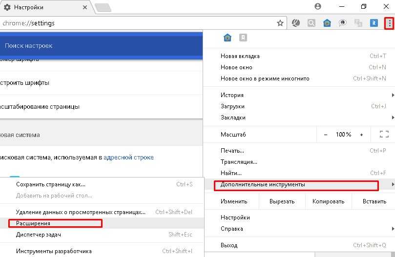 Откройте браузер, нажмите на панель меню в правом верхнем углу. Кликните по пункту «Дополнительные инструменты» и в контекстном меню выберите «Расширения». Наглядно показано на скриншоте ниже.