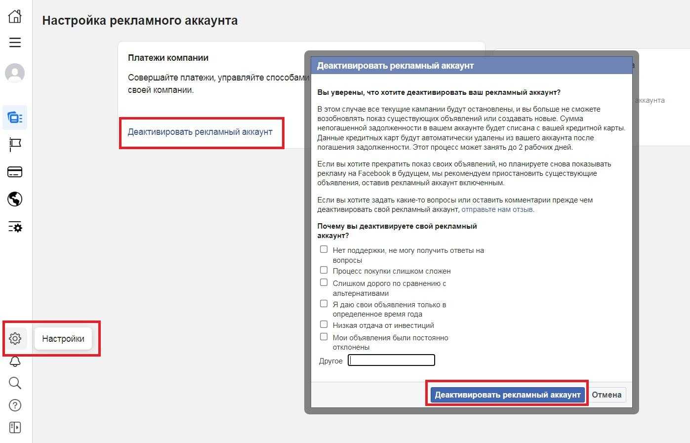 Удаляем рекламный аккаунт