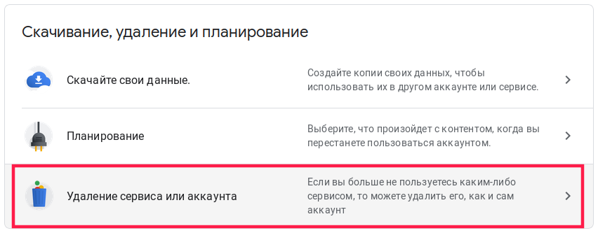 4. В блоке настроек «Скачивание, удаление и планирование» нажмите на пункт «Удаление сервиса или аккаунта».