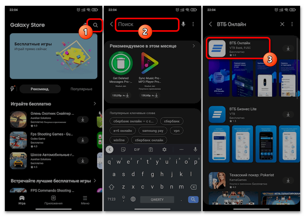 Другой путь к странице требуемого нам приложения: запускаем Galaxy Store, тапаем по кнопке «Поиск» в верхнем правом углу его экрана, вводим запрос в поле поиска по магазину, и затем нажимаем на название банковского софта в выданном каталогом списке ссылок.