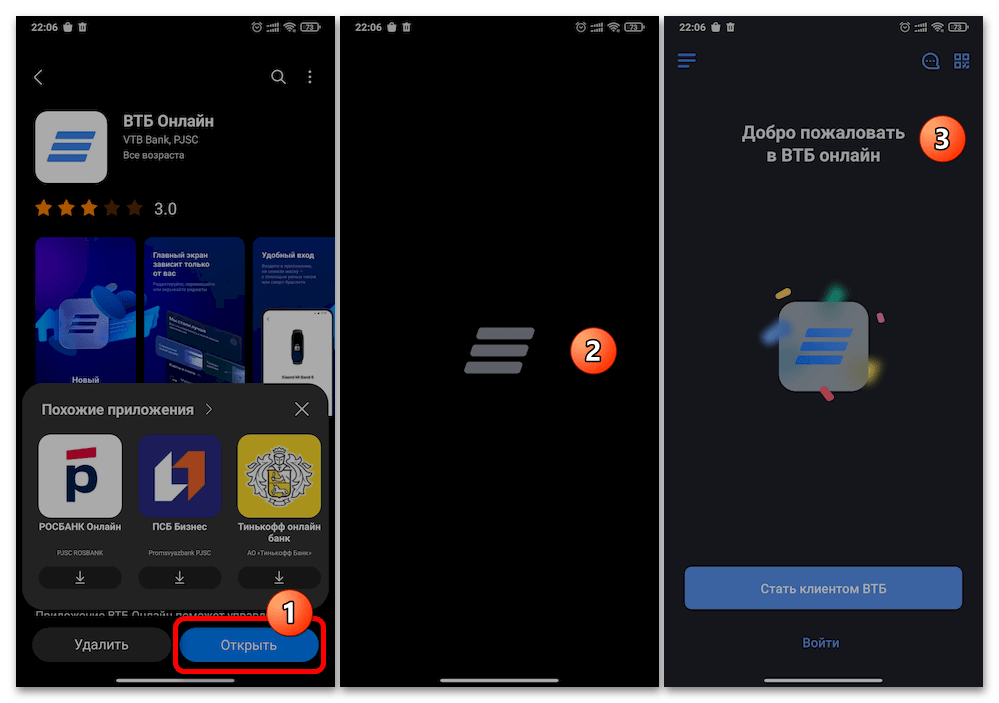 После того как кнопка «Установить» на странице ВТБ Онлайн в каталоге магазина приложений от Самсунг окажется заменённой двумя элементами – «Удалить» и «Открыть», инсталляция клиента банка считается завершённой, а его запуск впоследствии осуществим путём нажатия на присутствующий теперь в пределах «Домашнего экрана» смартфона значок «ВТБ».