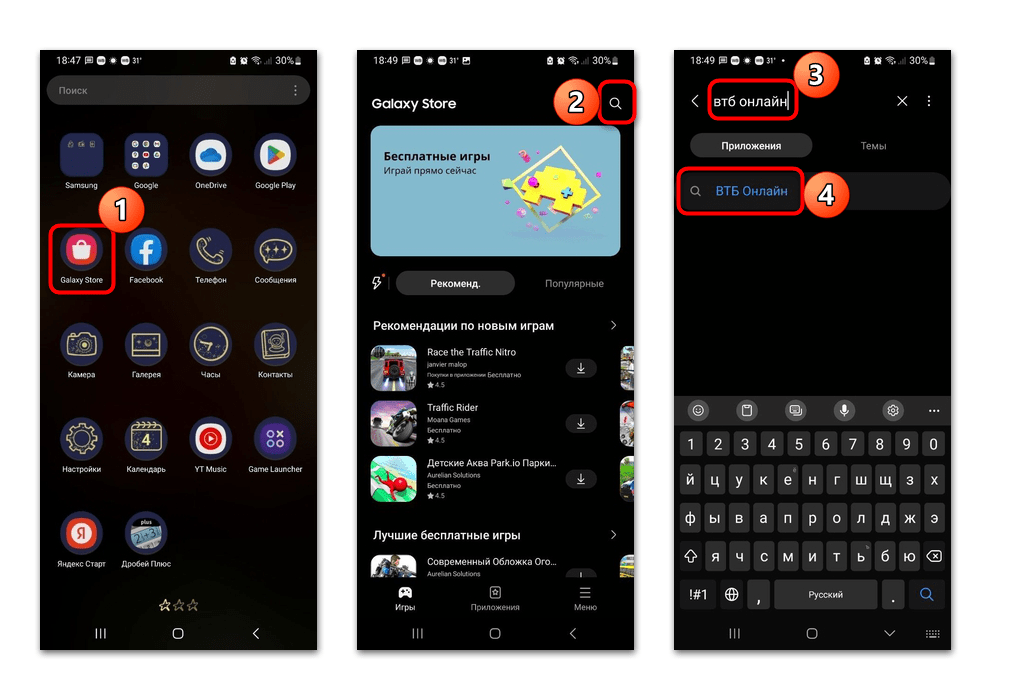 Создав аккаунт с помощью встроенных средств системы, никаких дополнительных действий не требуется – найдите в списке установленных приложений (в главном меню или на рабочем экране) приложение Galaxy Store, затем с помощью поисковой строки отыщите ВТБ Онлайн и перейдите на страницу с описанием софта, нажав по названию программы в результате поиска.