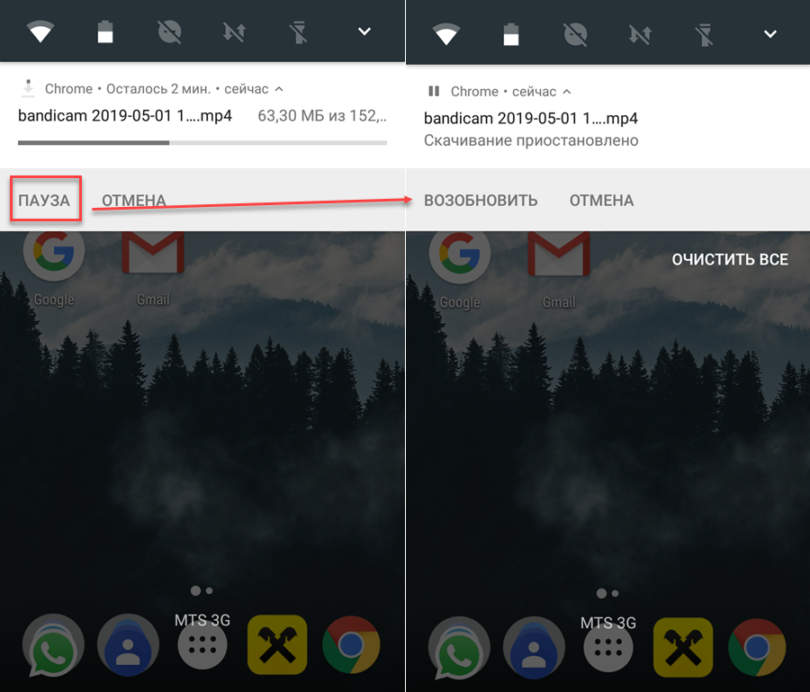 Шаг 2. Если вы скачиваете файл через браузер, то при вызове панели уведомлений появится кнопка «Пауза». Нажмите ее, чтобы временно приостановить загрузку. Используйте на кнопку «Возобновить», чтобы продолжить скачивать файл.