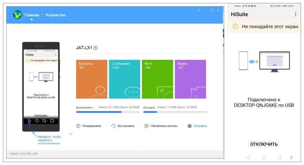 - Скачайте и установите на компьютере и смартфоне программу HiSuite. С ее помощью можно сохранить на ПК или ноутбуке, затем восстановить, не только файлы, но и контакты, а также SMS-сообщения.