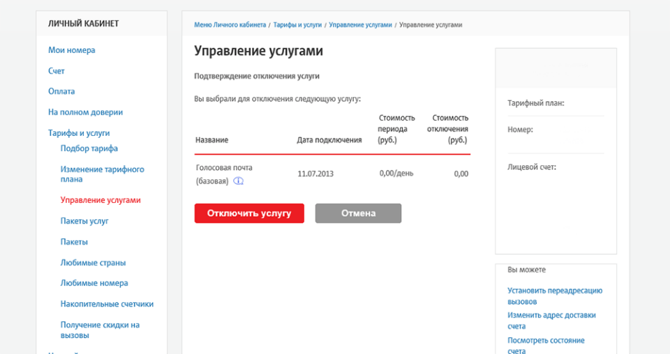 Применение личного кабинета – это легкий способ убрать сервис голосовой почты. Зайдя в него, переходят в работу с опциями. Напротив «голосовой почты» устанавливается «крестик». Аналогично отключается услуга, когда человек применяет мобильную программу.