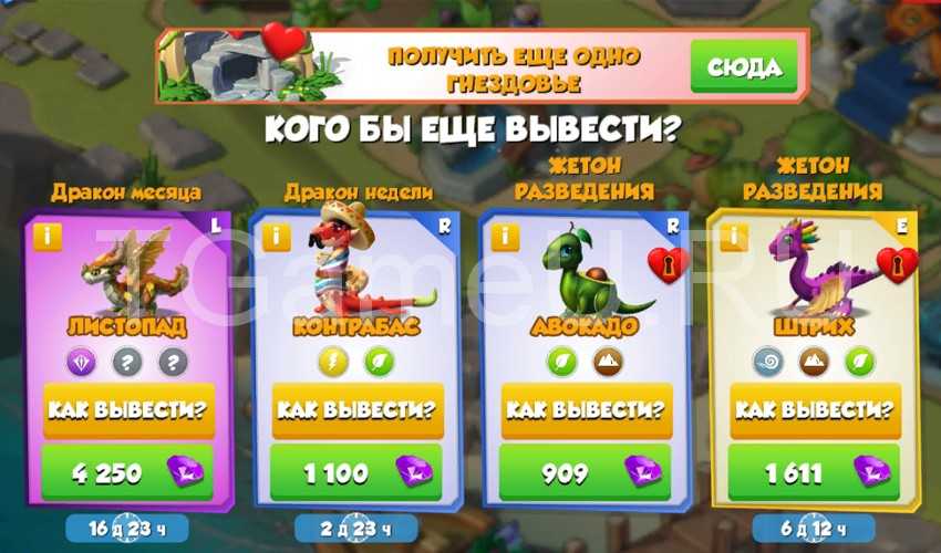 - Чем больше времени родители проводят в гнездовье, тем более редкого дракончика Вы получите. Время разведения может разнится от 30 секунд (Огонь) до 2 дней (легендарные питомцы).