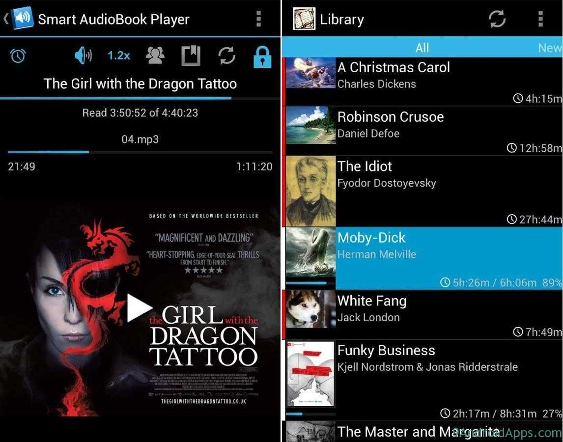 Smart AudioBook Player – довольно известная и удобная программа для воспроизведения аудиокниг. Функциональные возможности программы обеспечивают комфортное прослушивание любимых произведений. Удобный интерфейс позволяет быстро сориентироваться в приложении. Все загруженные книги разделены на четыре категории. Обложки закачиваются автоматически, но при желании их можно легко сменить.