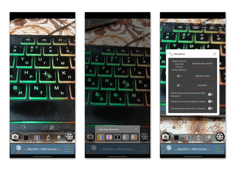 Еще одно простое и эффективное приложение, которое преобразовывает вашу камеру в полноценную лупу, — это Magnifier + Microscope. Здесь также можно включить светодиодный индикатор для подсветки рассматриваемого объекта, доступны фильтры изображений и заморозка экрана. Имеется поддержка управления жестами: в частности, единичное касание позволяет немедленно сфокусировать камеру, горизонтальным перетаскиванием контролируется экспозиция и вертикальным можно управлять масштабированием.