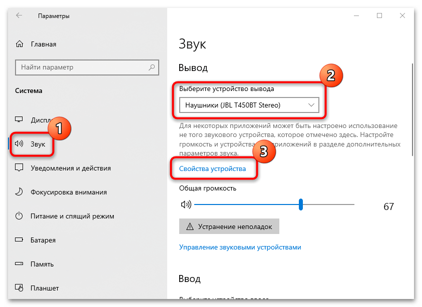 Перейдите на вкладку «Звук» на панели слева, затем выберите устройство для вывода, если оно не определилось автоматически. Раскройте меню и нажмите на название беспроводных наушников. Ниже есть ссылка для более гибкой настройки – «Свойства устройства». Нажмите на нее.