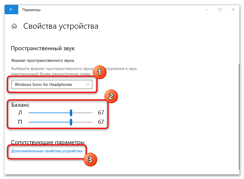 Здесь можно выбрать формат пространственного звука, а также настроить баланс левого и правого каналов. Нажмите на кнопку «Дополнительные свойства устройства».