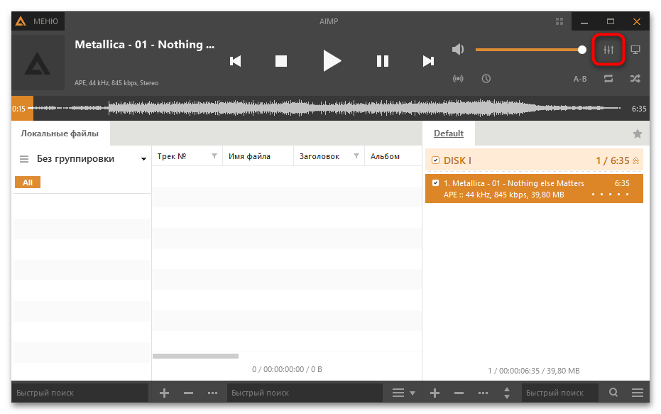 Устанавливаемые музыкальные проигрыватели для компьютерных операционных систем также располагают параметрами звука для беспроводных наушников (изменения не будут работать вне этих программ). После подключения достаточно запустить программу на ПК или ноутбуке, затем открыть раздел с параметрами. К примеру, в десктопной версии AIMP нужно кликнуть по иконке в виде эквалайзера прямо в интерфейсе или открыть главные настройки. Алгоритм действий зависит от используемой темы.