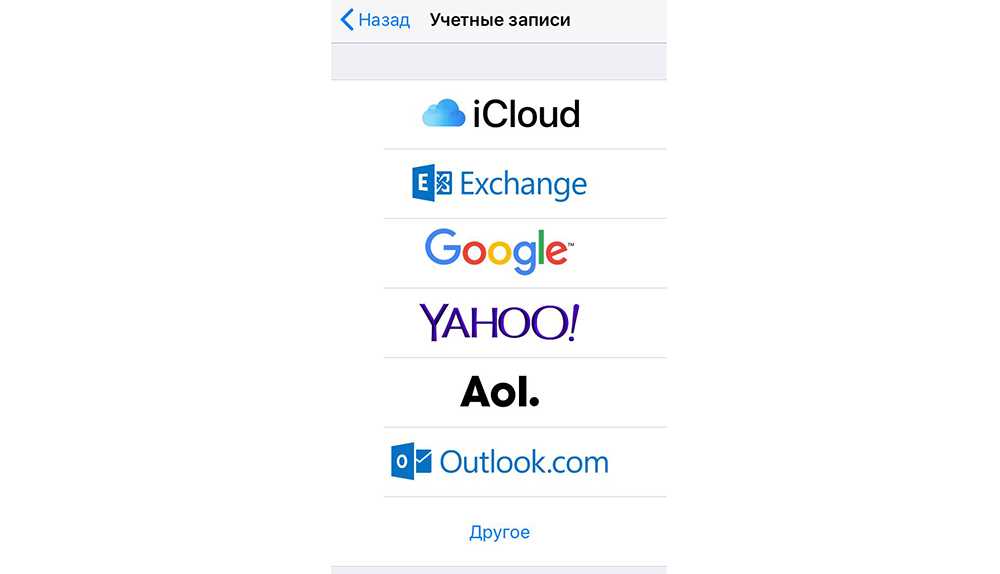 - В открывшемся меню выбрать нужный почтовый клиент – iCloud, Microsoft Exchange, Google, Yahoo, Aol., Outlook.com.