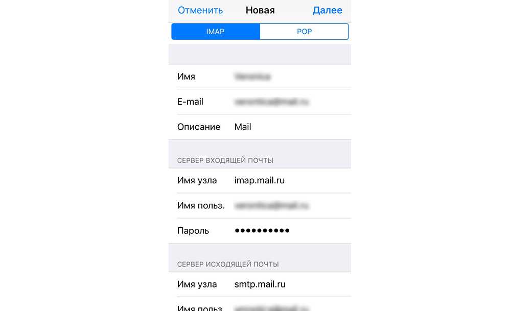 - Заполнить сведения в полях серверов входящей и исходящей почты, затем тапнуть на «Далее».