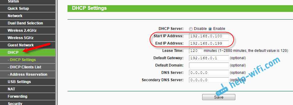 Возможно, вам понадобится установить ограничение не для определенных устройств, а для всех клиентов, которые подключены к маршрутизатору TP-LINK. Сделать это очень просто. Сначала, зайдите на вкладку «DHCP», и посмотрите, какой диапазон IP адресов там задан. Можете их запомнить, или скопировать.
