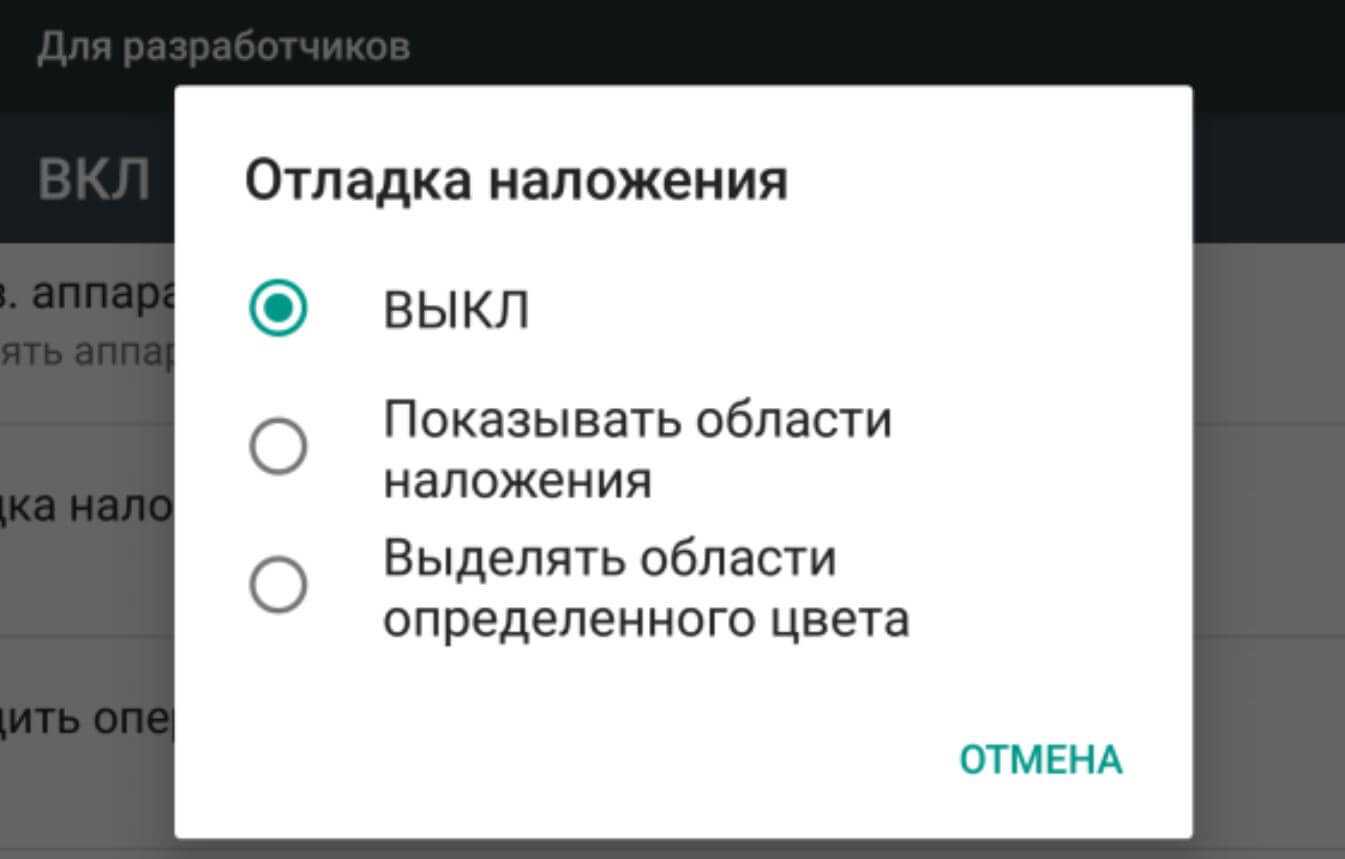 Другая настройка позволяет узнать, как часто перерисовывается один и тот же участок экрана (т.е. выполняется лишняя работа). Опять идём в Опции разработчика и находим пункт Отладить показатель GPU overdraw (Debug GPU Overdraw), который следует включить. В всплывающим окне выберите опцию Показывать зоны наложения (Show overdraw areas). Не пугайтесь! Нкоторые элементы на экране изменят свой цвет.