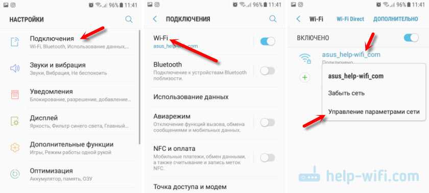 Зайдите в настройки, в раздел «Подключения» – «Wi-Fi». Нажимаем на свою сеть и держим. Должно появится меню, где нам нужно выбрать что-то типа «Управление параметрами сети».