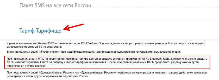 Проблема еще в том, что большинство операторов не указывают в описании тарифов правила использования интернет-трафика. Можно его раздавать на другие устройства, или нет – непонятно. Эта информация обычно указана мелким шрифтом в прикрепленном PDF файле, которые практически никто не читает. Вот для примера, как эта информация указана в подробном описании тарифа «Тарифище» от МТС: