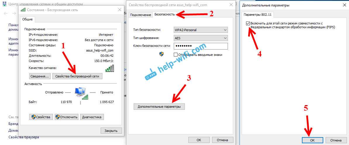 Если проведенные операции не привели к результату, то нужно включить режим совмещения стандартов. Для этого следует опять открыть окно с данными меню управления общим доступом, выбрать нужную сеть и вывести на экран окно ее состояния. Чтобы активировать режим совместимости с FIPS, нужно поставить соответствующую отметку напротив опции, предварительно посетив раздел с дополнительными настройками, расположенный в окне, регламентирующем функции безопасности. Если все было проведено по указанному алгоритму, то соединение должно появиться.