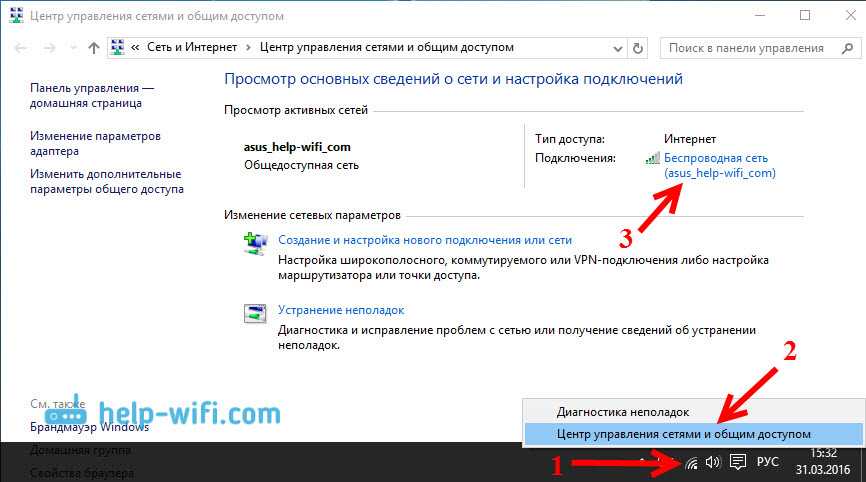 Нажмите правой кнопкой мыши на значок подключения к интернету, и выберите «Центр управления сетями и общим доступом». В открывшемся окне, нажмите на ссылку с названием вашей Wi-Fi сети. Как на скриншоте ниже.