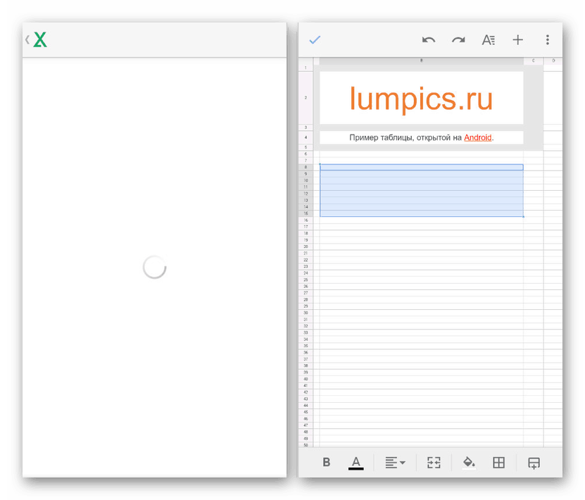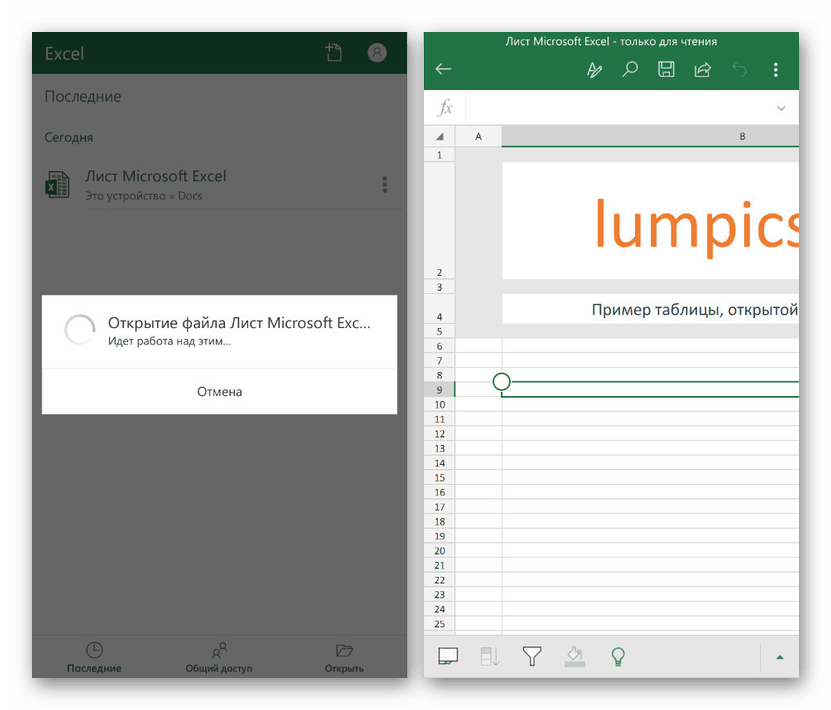 3. По аналогии с предыдущим приложением, файл XLSX можно открыть напрямую из файлового менеджера, предварительно установив Google Таблицы. В результате ПО будет работать так же, как и при открытии документа ранее описанным методом.