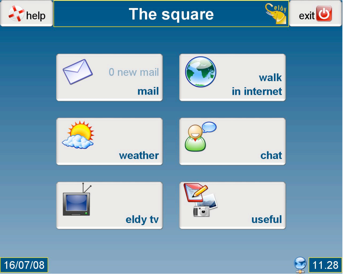 После установки Eldy пользователю отображается шесть больших кнопок для работы с почтой, интернетом, чатом, видеоконференциями, документами, изображениями, Skype и прочим.