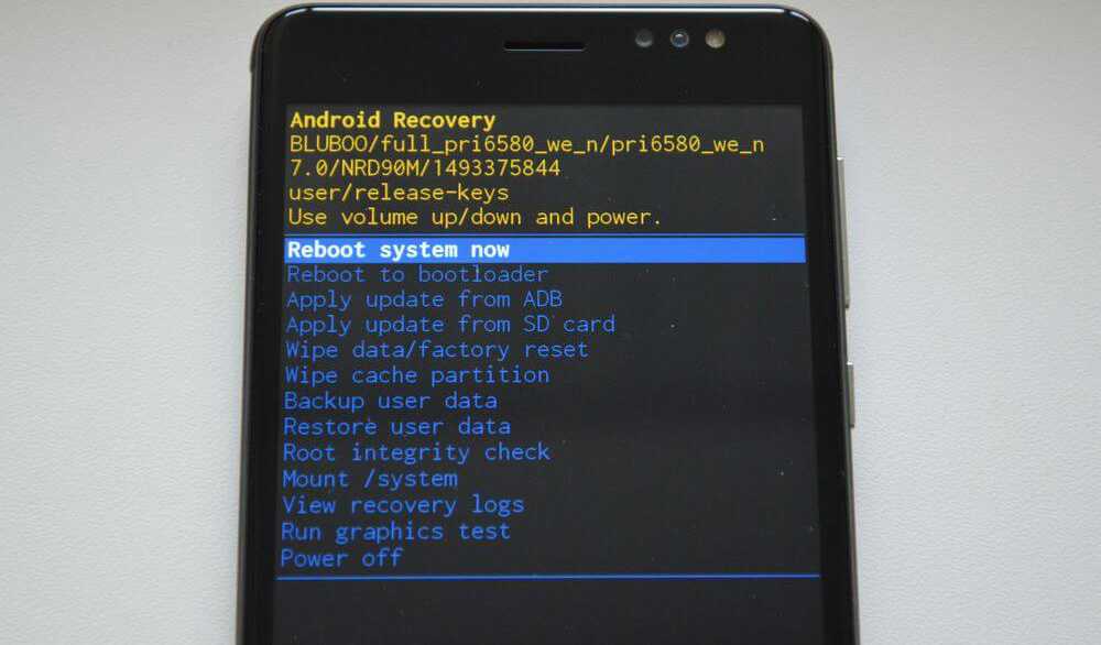 - «reboot system now» — перезагрузка, через него можно выйти из android system recovery, в зависимости от устройства, меню может содержать этот пункт в разделе «power menu»;