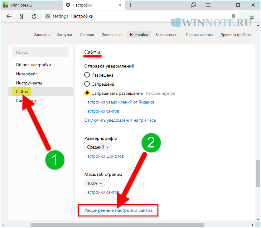 В настройках браузера, в левой панели выберите категорию Сайты, затем в правой части окна нажмите на ссылку Расширенные настройки сайтов