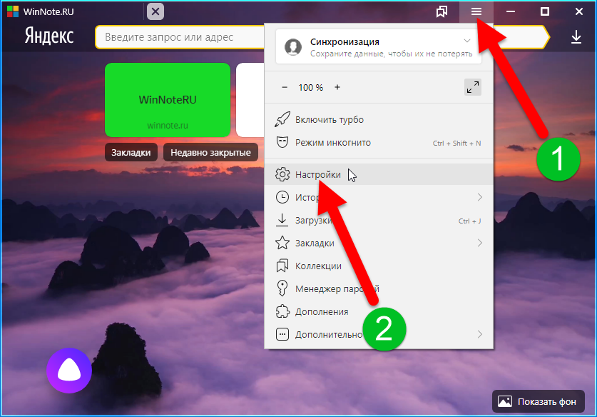 Чтобы отключить или включить отображение картинок (изображений) в Яндекс.Браузере, в верхней части окна браузера нажмите кнопку Настройки Яндекс.Браузера и в появившемся меню выберите Настройки.