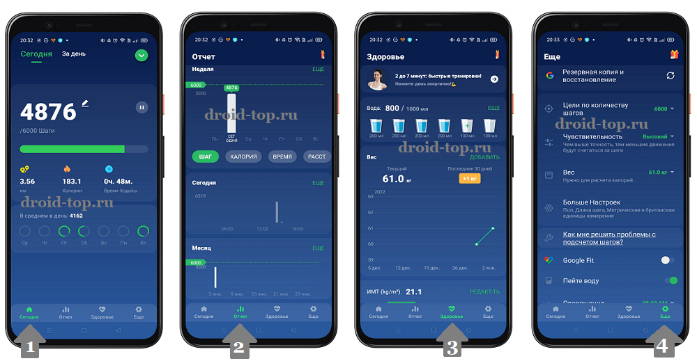 У Шагомера имеется четыре вкладки на главном экране:1. Сегодня.2. Отчёт.3. Здоровье.4. Ещё.