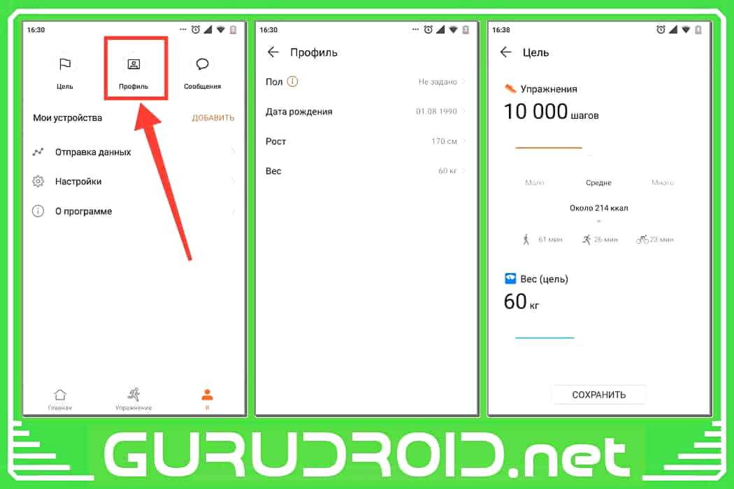 Перед тем, как рассмотреть принцип пользования шагомером, нужно сделать небольшие настройки. Для этого переходим во вкладку «Я», где нажимаем «Профиль». Указываем пол, дату рождения, рост и вес. При желании можно установить дневную цель шагов.