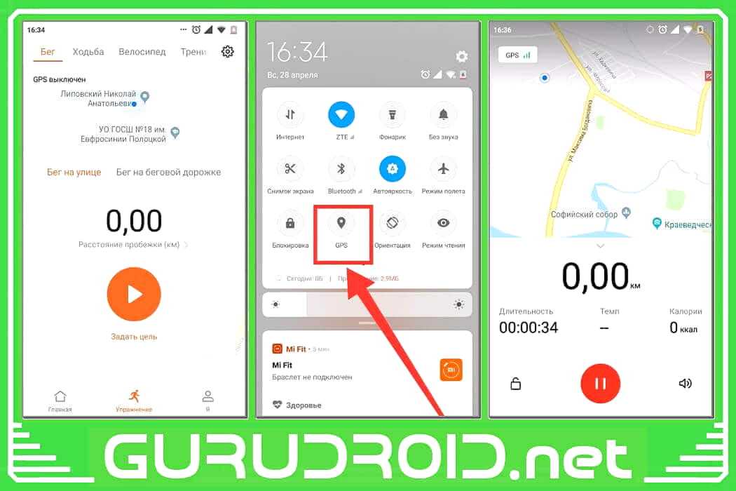 Включить GPS для проведения тренировки можно через шторку уведомлений, либо с помощью предоставления доступа к геолокации самому приложению.