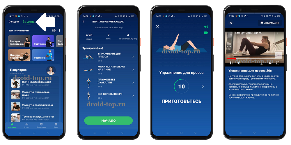 Приложение самостоятельно запускает отсчет времени и показывает, какое упражнение вам надо делать. Сопровождается это голосовыми подсказками.