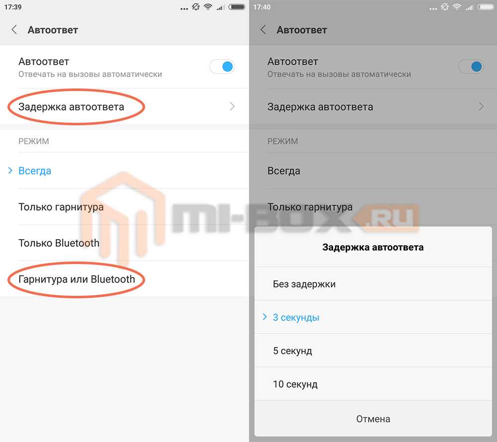 При желании можно выбрать режим, при котором будет осуществлен автоматический ответ (всегда, при подключенной проводной гарнитуре или при подключенной Bluetooth-гарнитуре), а также период времени, после которого вызов будет автоматически принят (сразу, через три, пять или десять секунд).