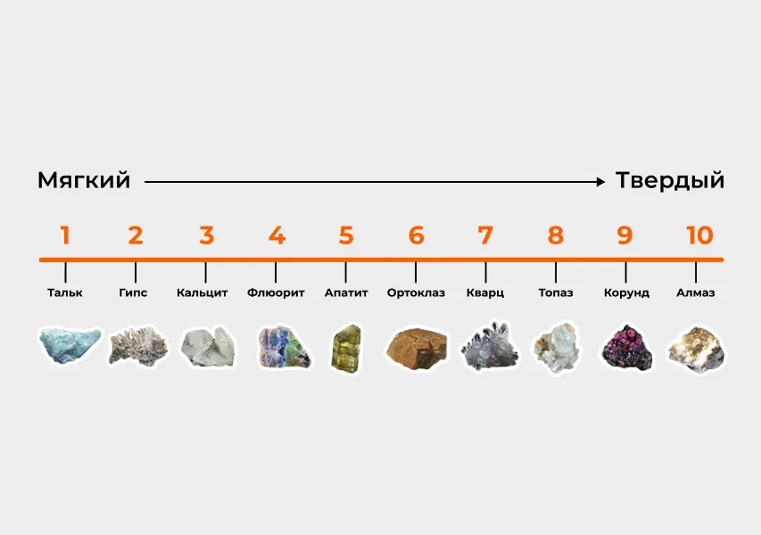 В данной шкале эталоном являются минералы. Тальк – отличается своей мягкостью. Алмаз – твёрдостью.