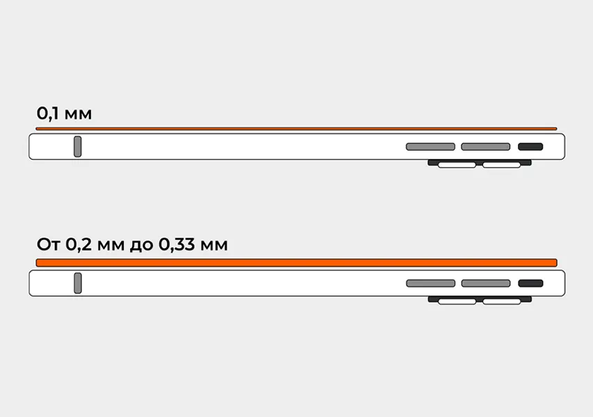 Толщина современных стёкол варьируется от 0,15 мм до 1 мм. В вопросах выбора рекомендуем ориентироваться на «золотую» середину — 0,3 мм.