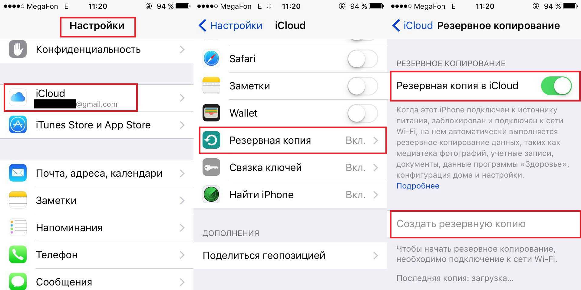 через меню iCloud («Настройки»/»iCloud»/»Резервная копия», включить ползунок «Резервная копия в iCloud», тапнуть «Создать резервную копию»)