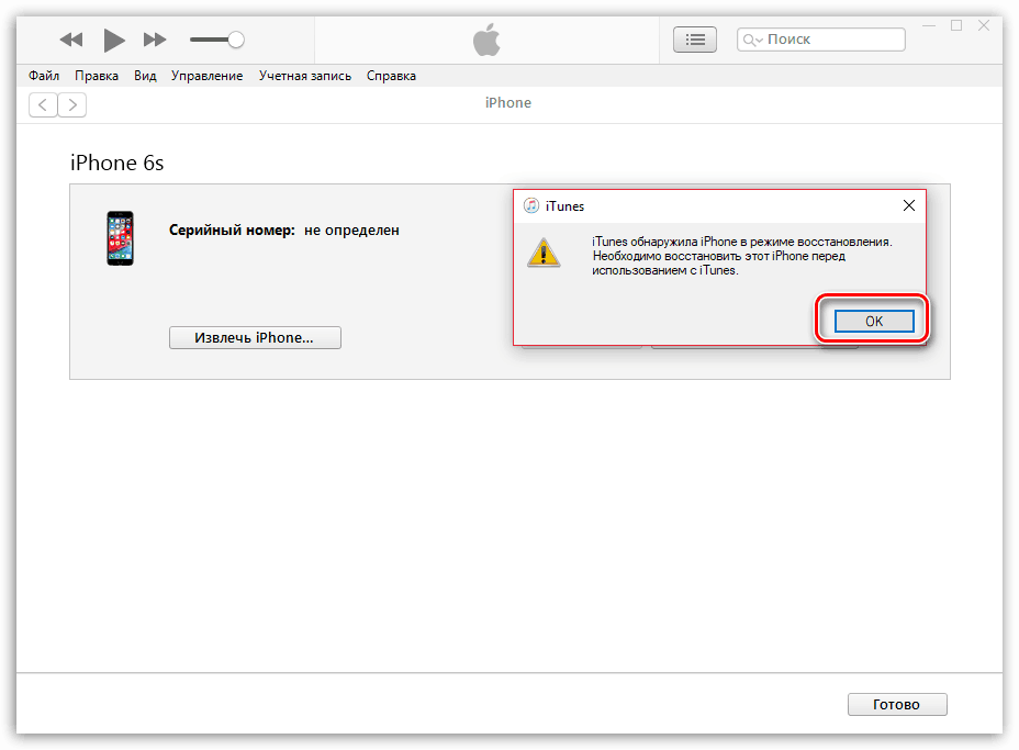 В случае успешного ввода смартфона в DFU, в окне iTunes определится iPhone. Щелкните по кнопке «ОК».