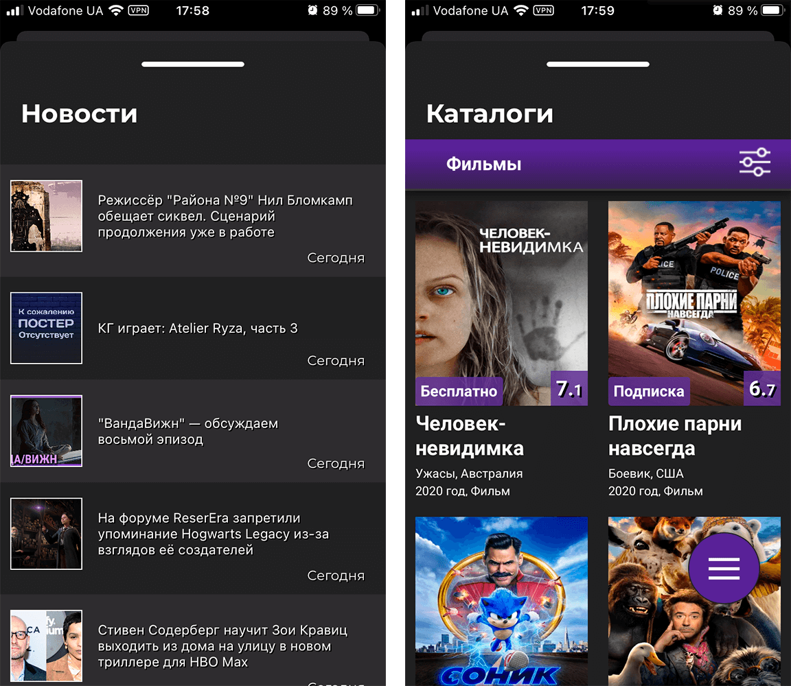Новости сервиса и каталог фильмов открывается при тапе по нужным кнопкам