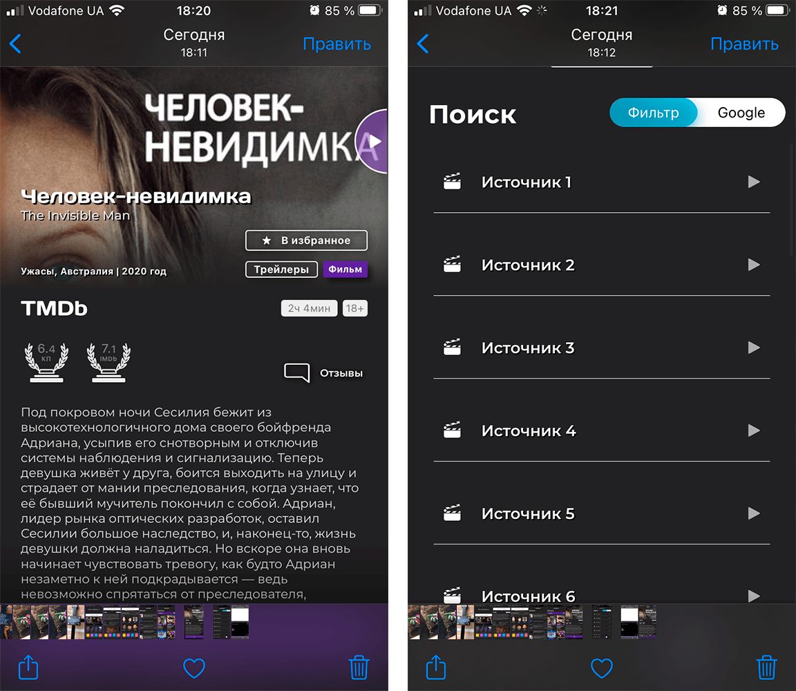 Допустим, мы выбрали нужный фильм или сериал из каталога, либо воспользовались поиском. У нас открывается описание фильма с кнопочкой для просмотра трейлера, а внизу кнопка поиска в виде белой лупы на фиолетовом фоне. Вот на эту кнопку и нужно тапнуть. Откроется окно с разными источниками воспроизведения. При выборе первого попавшегося мне фильма поиск выдал 31 источник, из них с плеером для воспроизведения видео — 10. Тапаем по первому же источнику и получаем окошко с плеером.