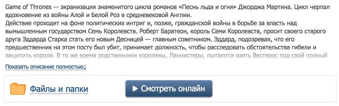 Для просмотра фильма или сериала необходимо ввести в поиске сайта желаемое слово, либо можно вручную искать нужный видеофайл через навигацию сайта. После попадания на интересующую страницу необходимо нажать на «Файлы и папки», затем выбрать сезон, серию, озвучку и качество. После этого фильм или сериал начнет мгновенно воспроизводиться на Mac, iPhone или iPad. При желании размер окна можно растянуть на весь экран, что также будет очень полезно при просмотре контента на Mac или PC.
