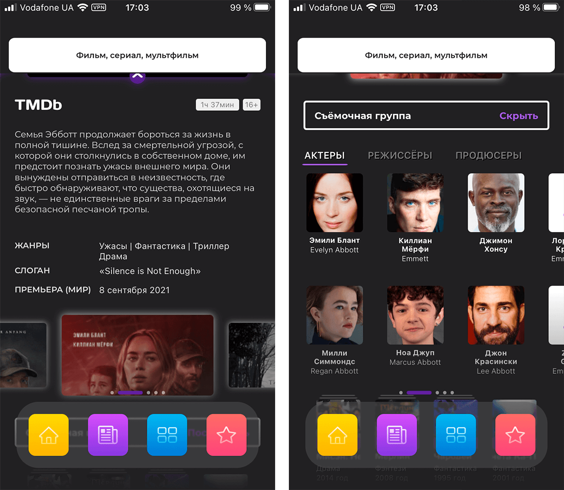 Помимо просмотра, в приложении есть и другие полезные фишки. Если нажать на трейлер, в ленте открывается описание фильма, а ниже еще одна интерактивная лента с обложками фильма в разных кинотеатрах. Ниже этой ленты — спойлер с информацией о съемочной группе. Также здесь доступны имена с фотографиями актеров, режиссеров и продюсеров.