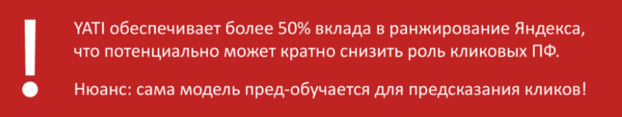 То есть потенциально у Яндекса есть возможность отказаться от активного учета кликовых факторов. Но очень важный нюанс состоит в том, что сама модель предобучается на предсказание кликов. Все было бы круто, если бы мы были уверены, что эти клики и сигналы не накручены.