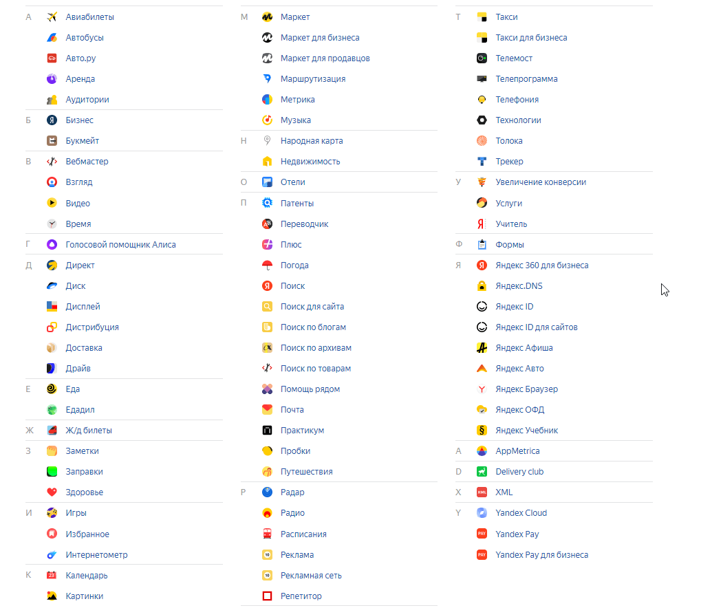 У Яндекса столько разных сервисов, что они не поместились на одном экране даже мелким шрифтом