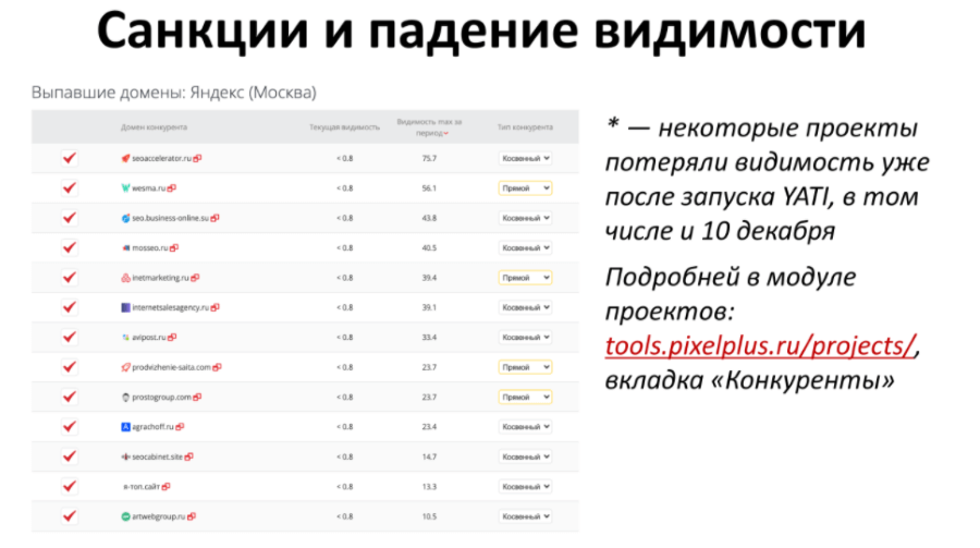 У нас есть вкладка «Конкуренты» в модуле проектов, которая позволяет смотреть, какие проекты имели хорошую видимость, а какие стремительно провалились. В выбранной тематике таких сайтов более десятка. Мы ни в коем случае не утверждаем, что все выбранные сайты накручивают ПФ, но так решил Яндекс.