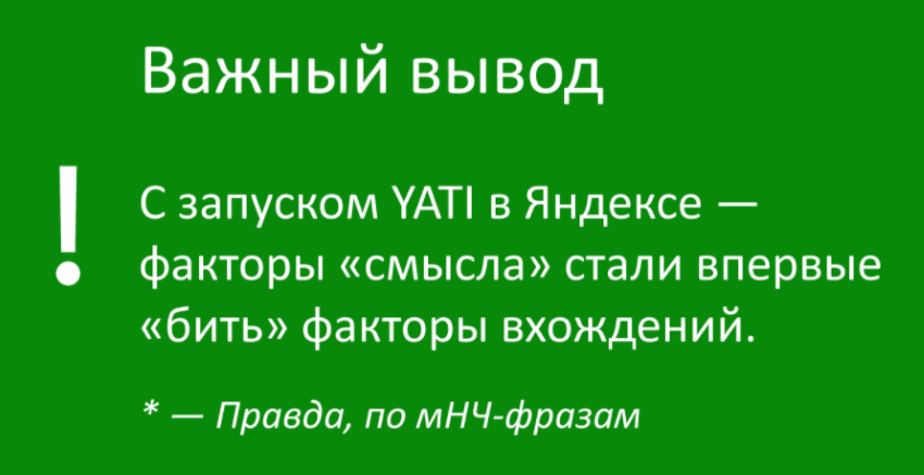 На наш взгляд, YATI – это тот самый момент, когда факторы смысла и смысловой близости запросов документа стали побеждать факторы вхождения, что очень хорошо видно на низкочастотных поисковых запросах.