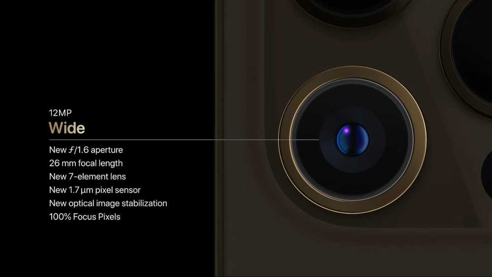 Камера с семью линзами пропускает на 27% больше света по сравнению с прошлым поколением благодаря большей диафрагме ƒ/1.6 против ƒ/1.8 в iPhone 11.