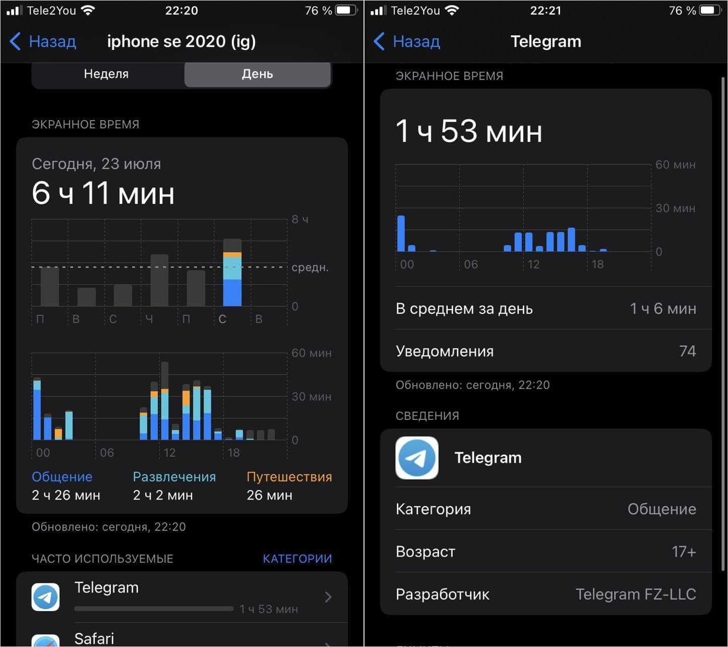 Под шкалой активности вы сможете просмотреть, какие приложения и сколько времени работали. Например, вы просто открыли Telegram на пару минут и вышли из него, а на графике стоит время 1 час и 53 минуты. Разве не подозрительно?