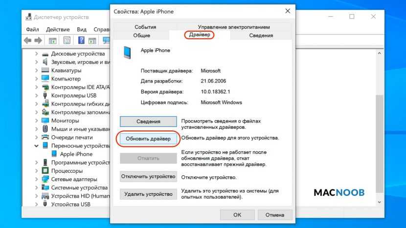 Открываем «Apple iPhone», переходим на вкладку «Драйвер», жмём кнопку «Обновить драйвер».