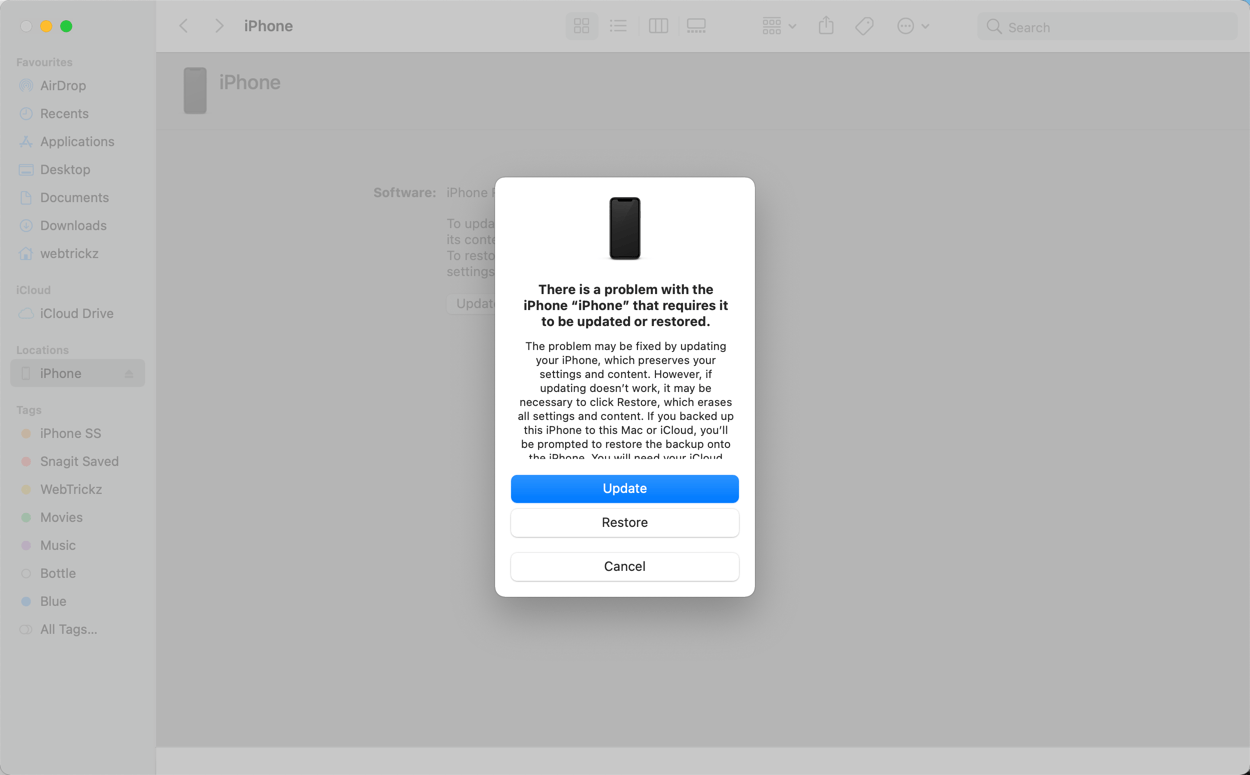 Вот и все. iTunes или Finder (в macOS Catalina и Big Sur) теперь будет отображать запрос на обновление или восстановление вашего iPhone. Выберите вариант, соответствующий вашим потребностям.